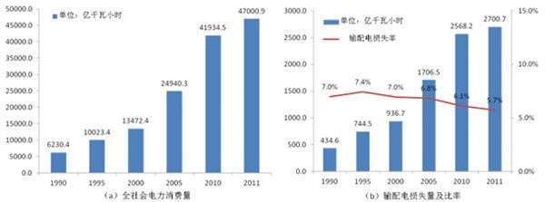 自改革開放以來,我國城鎮(zhèn)化水平快速提升,2013年我國城鎮(zhèn)化率為53.73%,但與發(fā)達國家相比還處于較低水平。2013年中央城鎮(zhèn)化工作會議指出,城鎮(zhèn)化與工業(yè)化一道,是現(xiàn)代化的兩大引擎。但近年來我國經(jīng)濟社會發(fā)展面臨著越來越嚴峻的資源環(huán)境約束,圖1是根據(jù)國家統(tǒng)計局數(shù)據(jù)繪制的我國全社會電力消費量和損耗變化情況,隨著城鎮(zhèn)化的推進,未來人們對電力的需求將持續(xù)增加。