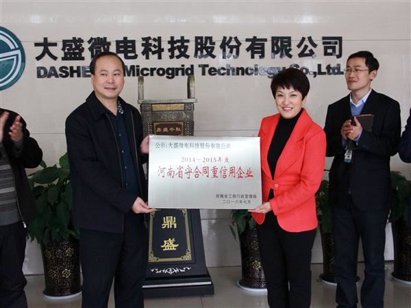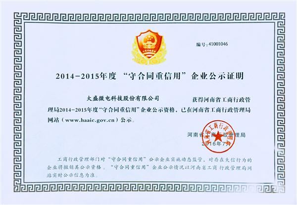 在河南省工商行政管理局開展的“守合同重信用”企業評選活動中,公司榮獲 2014—2015年度河南省“守合同重信用”企業榮譽稱號。這是公司在生產經營中,繼多次被評為許昌市“守合同重信用”企業后獲得的又一殊榮。
